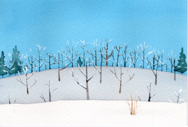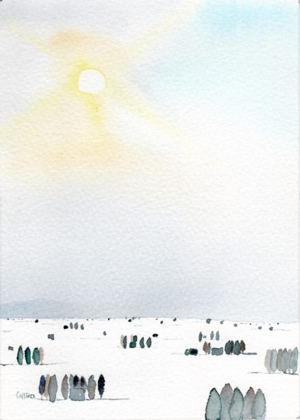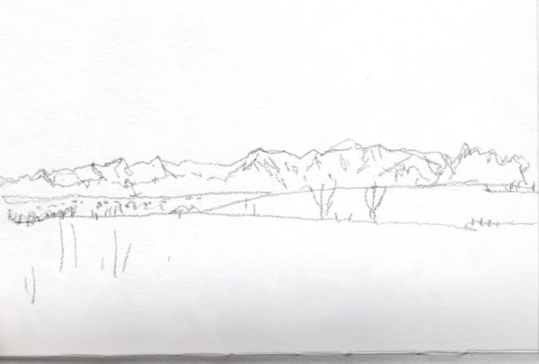 このところ晴天が多いです。ランニング中にとてもきれいな山並みが見えたので、後で車で同じ場所に行ってスケッチしました。