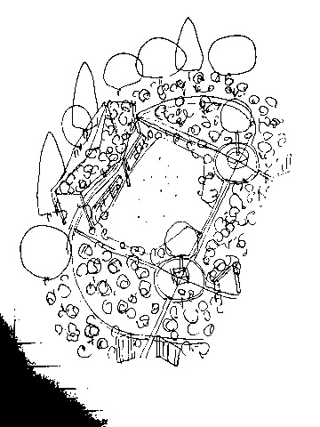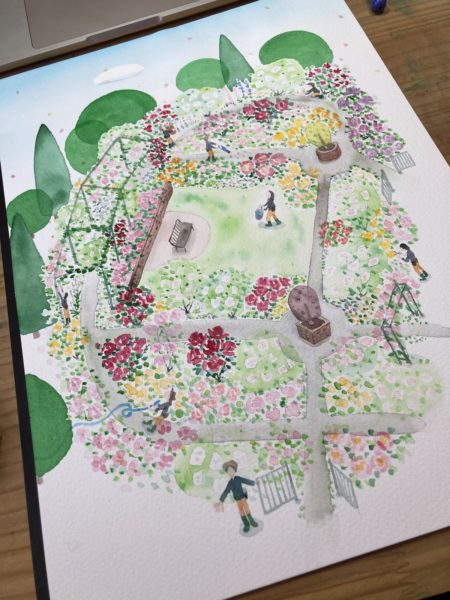 ありがたいことに、僕は開園前の時間にスケッチに入らせてもらっていたので、ガーデナーさんたちの働きぶりを目にすることが多かったです。この絵にはそんなガーデナーさんの姿を描き込んでいます。