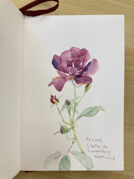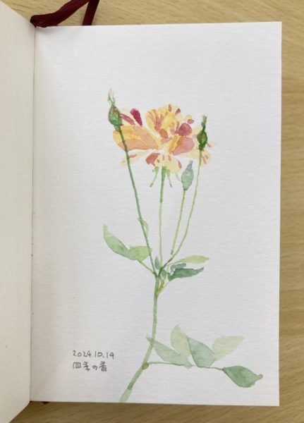 今日のスケッチはここの象徴とも言えるバラ、四季の香。黄色の花弁に赤い絞りが入っています。