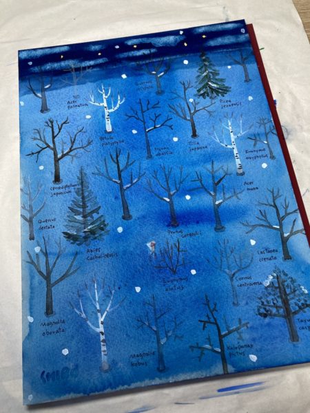 今のような冬の時期だと、やはり雪と樹木の風景を元にすることが多くなります。とはいえ風景をそのまんま再現できるほど上手ではないので、自分の描き方に形を変えて、エッセンスだけでも再現したいと思っています。