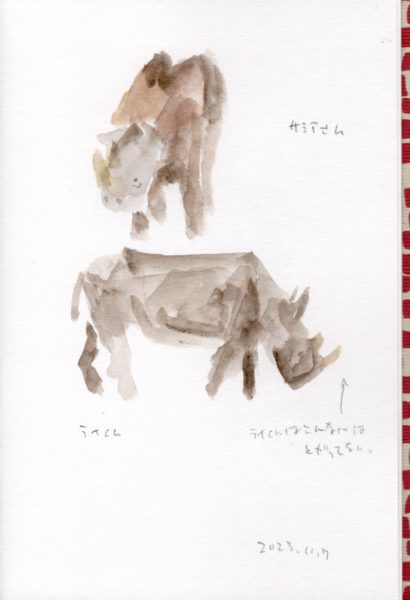 2頭のサイ。下の方はツノが折れているのかそれともよく見えないのかわからないのでとりあえずツノを描いたのですが、実際は「ツノが丸い」子でライくんというのだそうです。