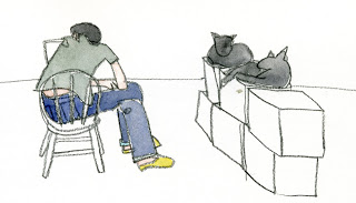 ネットを見る妻と黒猫2匹