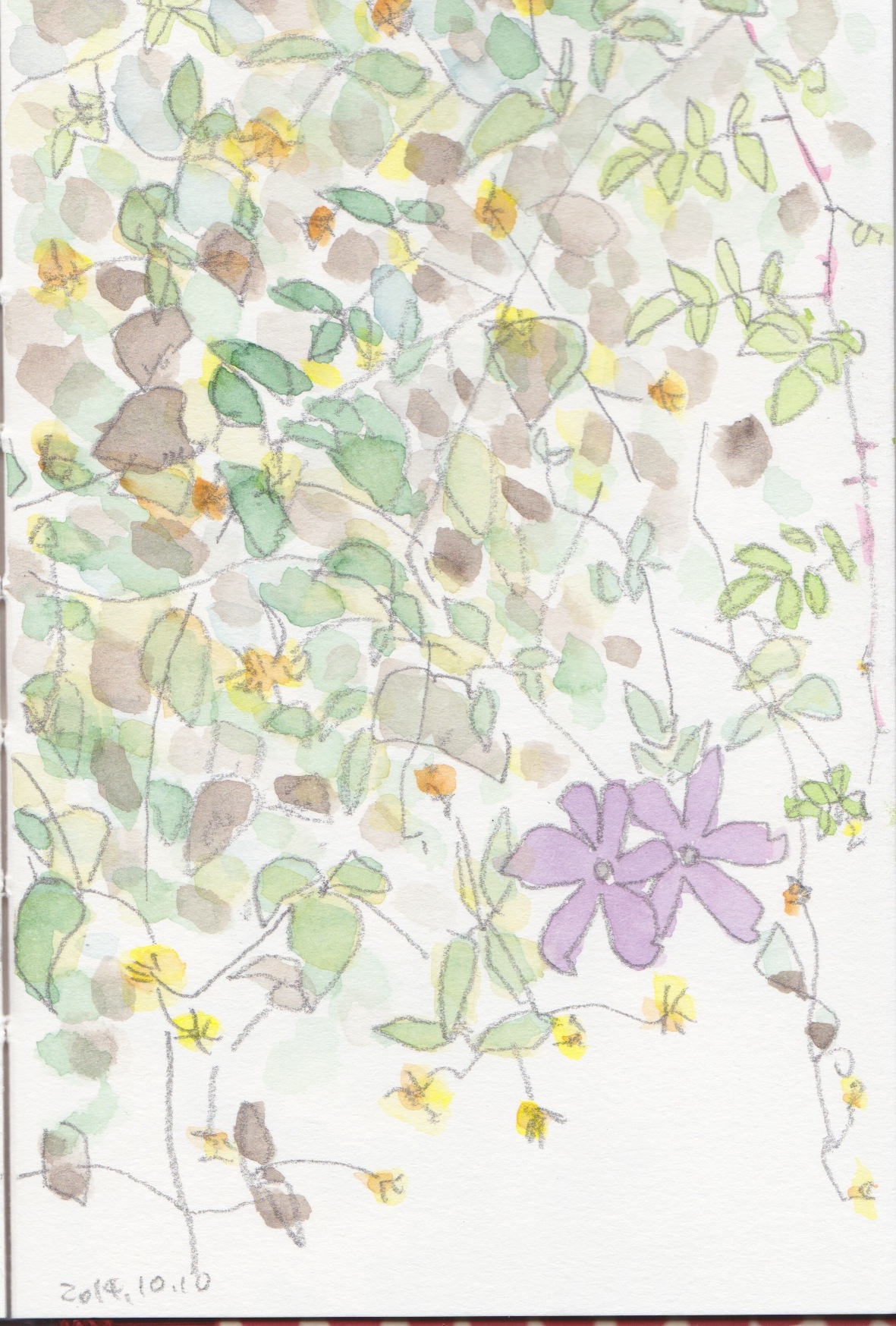 バラの枝と秋の風情 投稿日時: 2014-10-12 投稿者: shiro 線って好きです。色よりも。 バラは花もいいと思いますが、枝もいいと思います。この時期、伸びた枝がびよーんと空中に浮かんでいる様子に惹かれます。 この時期の風情といえば、満開の花よりも終わりかけの風情も好きです。 クレマチス。葉がだいぶ枯れてきています 花のシーズンももう少しですね。このスケッチをさせてもらったコテージガーデンさんも今年の営業は次の週末までだそうです。