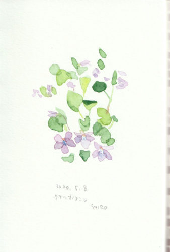 昨日に引き続き、今日もタチツボスミレのスケッチ。葉っぱがクルンとなっているところがかわいい。そして花の中央がちょっとオレンジ色がかっていて、細かいラインがそこから放射状に出ています。なかなか芸が細かいです。