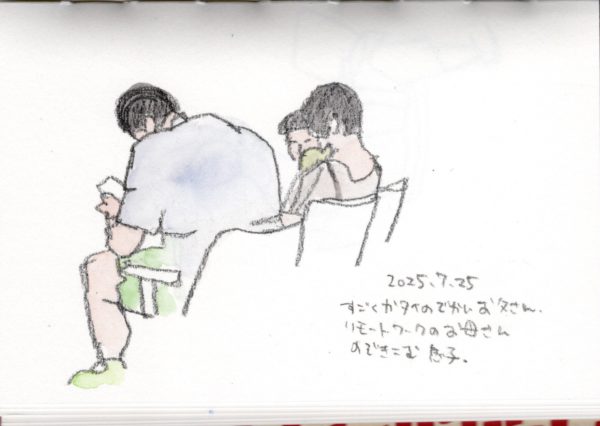 筋トレする人なのか、やたらとガタイのいいお父さん(ふくらはぎがすごい)、リモートワークなのかパソコンで仕事をしているお母さん、それを覗き込む息子。
