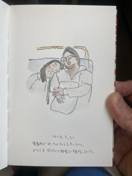 電車で爆睡するカップル。体型が同じなのできっと仲も良いことでしょう。