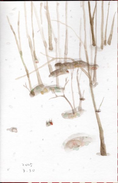 日々広がって笹の緑色も見えていた幹の周りの土も、今日はまた少し雪に覆われました。