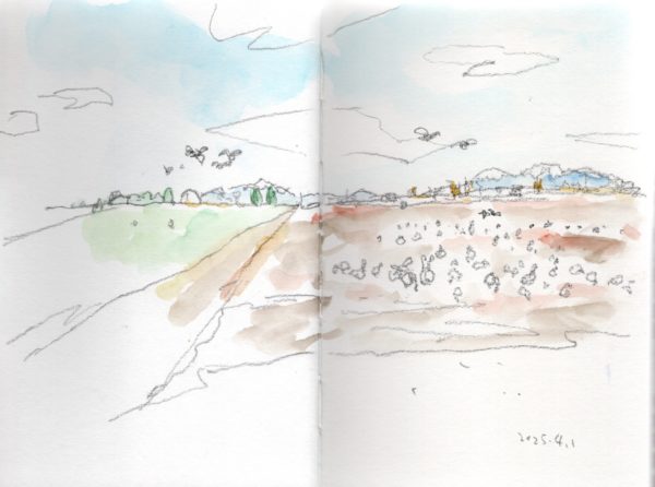 見ているのがすごく楽しい。飽きないです。でも見てばかりもいられないので、帰って自分の昼ご飯を食べてからスケッチブックを持って車で出かけ直しました。